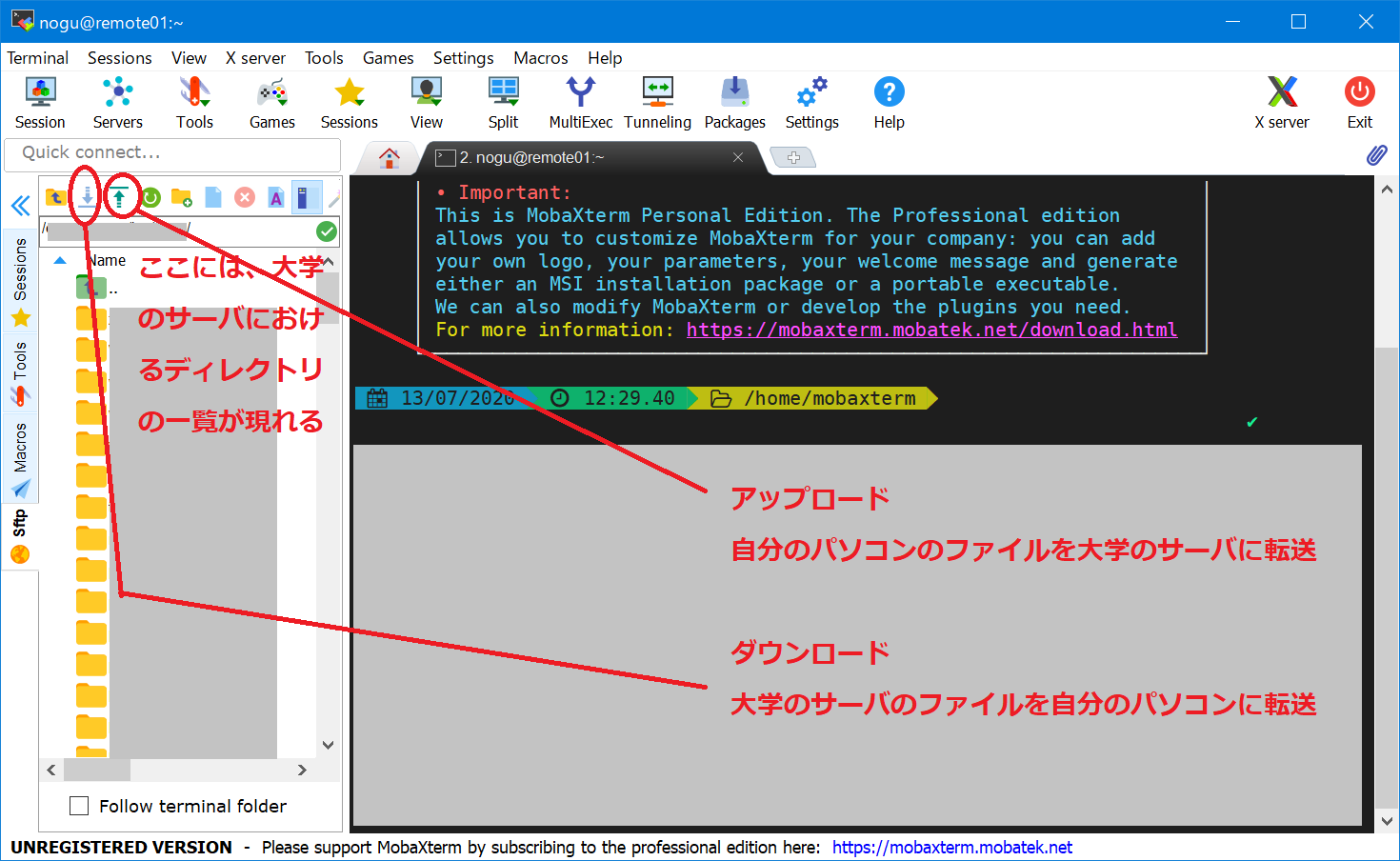 - MobaXtermの左のウインドウにある「↑」(アップロード)、「↓」(ダウンロード)マークをクリック。