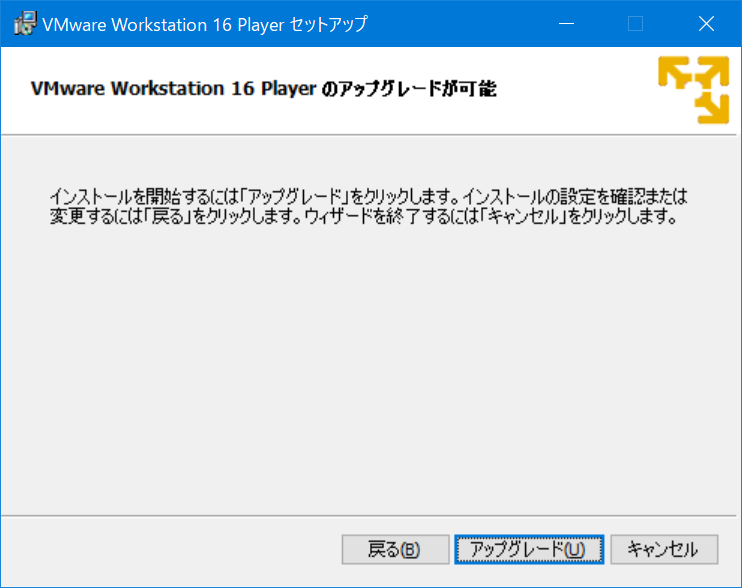 - もし、既にVMwareをインストールしたことがあったら「アップグレード」となるが、この場合も「アップグレード」をクリックすればよい