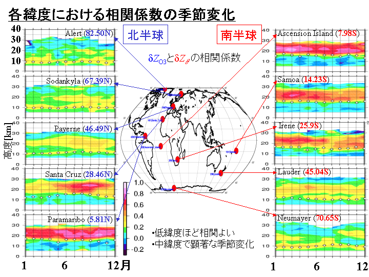 成層圏オゾンの鉛直微細構造の生成機構は、水平移流と鉛直移流に分けられる。水平・鉛直移流の区別は、温位とオゾン混合比の相関を調べることにより可能である。温位の変動は空気隗の断熱的な鉛直変位によると仮定すると、相関が高い場合にはオゾン変動は大気の鉛直移流に起因するとみなせる。従って、相関を調べることにより、観測されたオゾン変動に鉛直移流がどの程度寄与しているか推測できる。オゾンと温位の相関係数の全世界的な分布及び季節変化の大規模な調査は、これまでに例が無い。